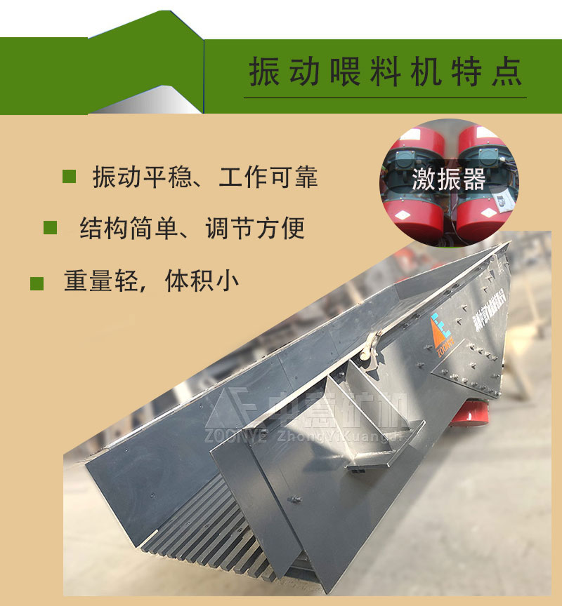 振動(dòng)給料機(jī)在生產(chǎn)流程中,可把塊狀、顆粒狀物料從貯料倉(cāng)中均勻、定時(shí)、連續(xù)地給到受料裝置中去,在砂石生產(chǎn)線中,可為破碎機(jī)械連續(xù)均勻地喂料,并對(duì)物料進(jìn)行粗篩分,廣泛用于冶金、煤礦、選礦、建材、化工、磨料等行業(yè)的破碎、篩分聯(lián)合設(shè)備中。