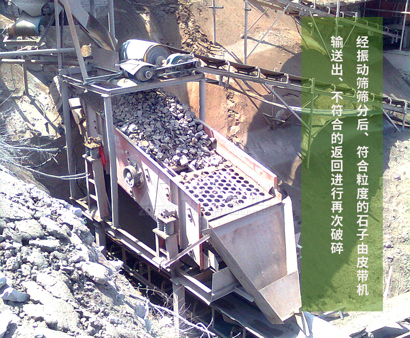 石料從山上爆破下來(lái),通過(guò)自卸車(chē)將小于400mm的石料送入振動(dòng)給料機(jī),振動(dòng)給料機(jī)把石料均勻的送入顎式破碎機(jī),顎式破碎機(jī)對(duì)石料進(jìn)行段破碎,從顎破出來(lái)的石料在70mm以下,再通過(guò)皮帶機(jī)輸送至反擊破進(jìn)行二級(jí)破碎,破碎后的物料由皮帶機(jī)輸送至制砂機(jī)進(jìn)行細(xì)碎(注:原礦在40mm以下可直接由制砂機(jī)進(jìn)行細(xì)碎),細(xì)碎后的物料再通過(guò)圓振篩進(jìn)行粗砂、中砂、細(xì)砂等規(guī)格的篩分。對(duì)于砂子含粉量要求嚴(yán)格的可在細(xì)砂后面加配洗砂機(jī),洗砂機(jī)排放的污水可再經(jīng)細(xì)砂回收機(jī)進(jìn)行回收,一方面減少環(huán)境污染,另一方面可提高制砂產(chǎn)量。