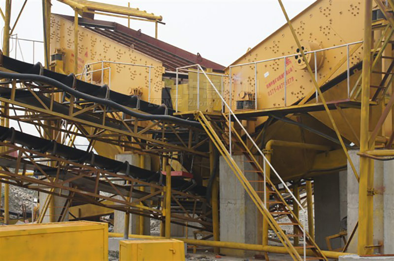 碎石生產(chǎn)線的流程較復雜.大致為:(料倉)->振動給料機->顎式破碎機->反擊式破碎機->振動篩->(成品石料)->沖擊式破碎機->振動篩->洗砂機->(成品砂).其中,振動篩可以共用,也可以分開來使用.各設備中間以溜槽或皮帶輸送機實現(xiàn)不同物理的傳送。